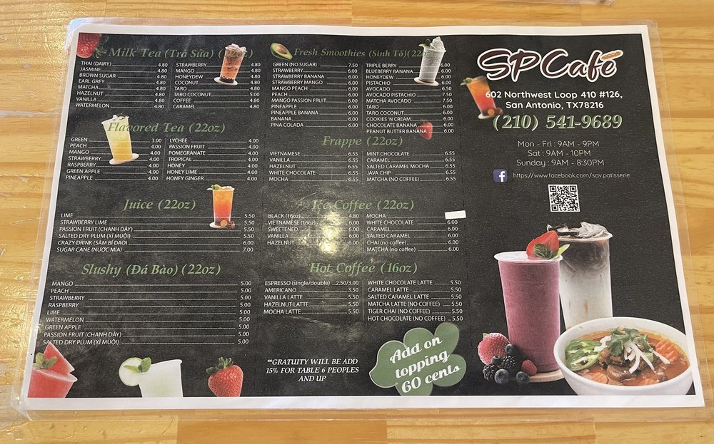 SP Café is a Vietnamese cafe located in San Antonio, TX, offering a wide range of beverages including artisan hot chocolate, mocha lattes, boba teas, and fresh juices. The cafe provides a cozy atmosphere with free Wi-Fi, making it a great spot for both individuals and families. The menu features various vegan options and accepts different payment methods, including cryptocurrency. SP Café is also wheelchair accessible and allows dogs, making it a welcoming place for all customers. With a diverse menu and a focus on quality ingredients, SP Café is a must-visit for those looking to experience authentic Vietnamese flavors in a relaxed setting.